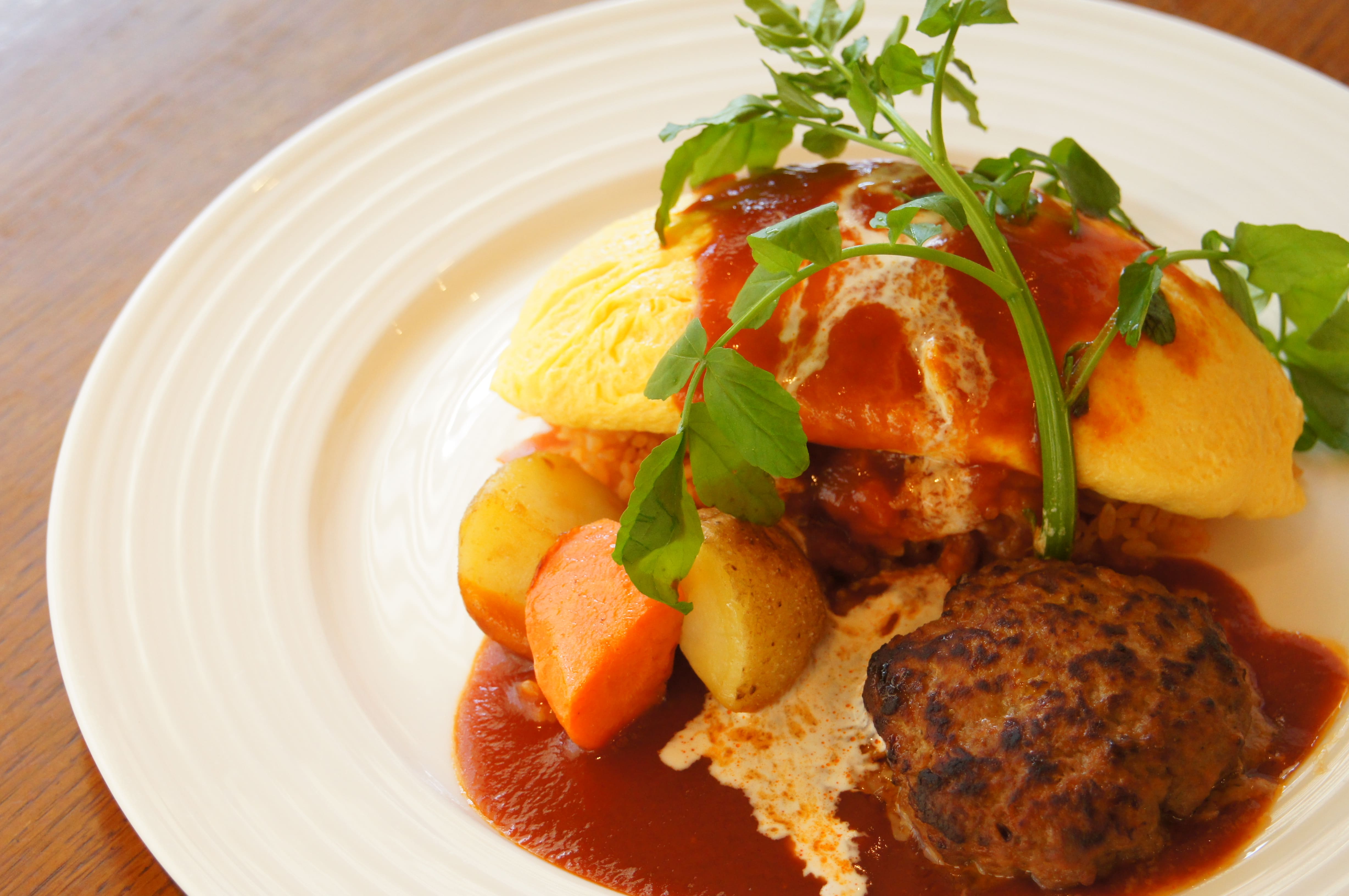 | ・半熟卵のオムライス トマトカレーソース (サラダ付き) 能登牛と能登豚のハンバーグ添え | 1,980円 |