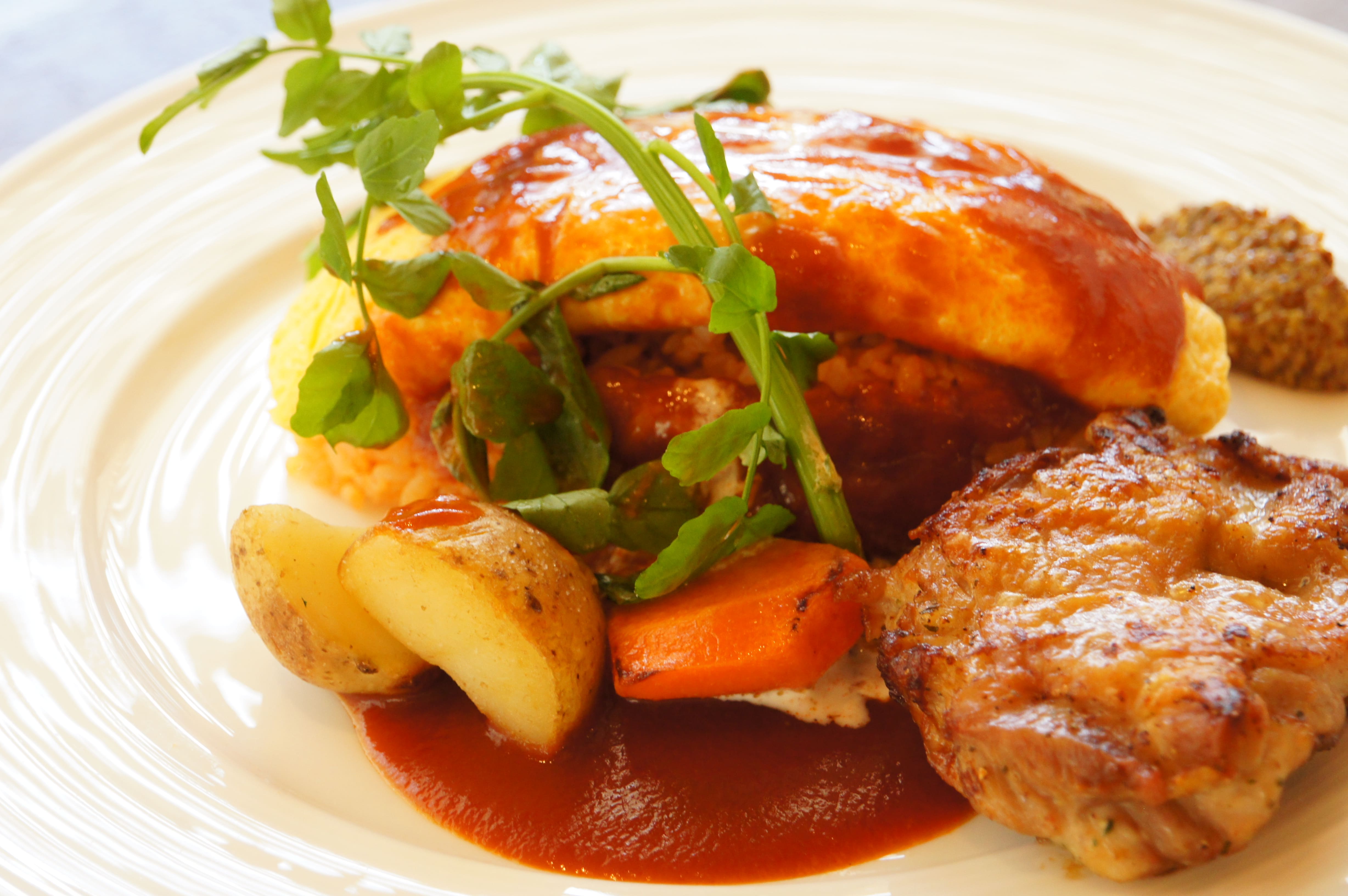 | ・半熟卵のオムライス 国産チキンのソテー添え 自家製デミグラスソース マスタード添え | 1,980円 |